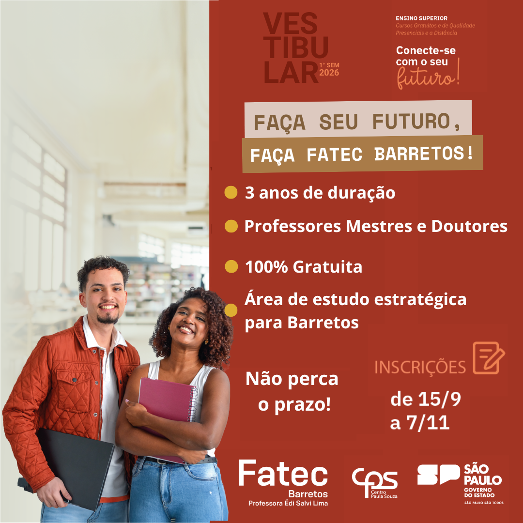 Inscrições no vestibular Fatec 15 set a 07 nov