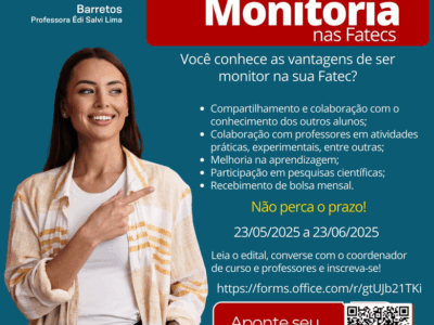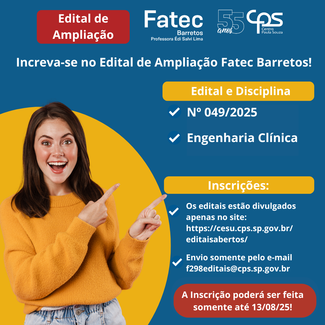 A Fatec Barretos está com inscrições abertas para o Edital 049/2025, referente ao oferecimento de aulas na disciplina Engenharia Clínica, integrante do curso de Gestão Hospitalar. A disciplina será ministrada às terças-feiras, das 19h10 às […]