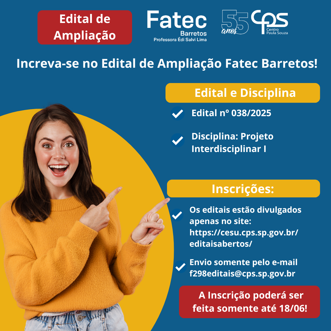 A Fatec Barretos está com editais abertos para contratação de professores (da própria unidade) para atuação em disciplinas específicas nas unidades de Barretos.